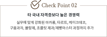 ÆÛ½ºÆ® Á¦°úÁ¦»§Çпø¿¡¼­´Â Çѱ¹ Á¦°ú¡¤Á¦»§ÇùȸÀÇ Ä¿¸®Å§·³À» ¹ÙÅÁÀ¸·Î ¸¶Ä«·Õ, Ÿ¸£Æ®, ÄÉÀÌÅ© µ¥ÄÚ·¹À̼Ç, ±¸¿ò°úÀÚ, ºí¶ûÁ¦, ÃÊÄݸ´, Á¦°ú/Á¦»§ ±â´É ¸¶½ºÅÍ·Î ÀÌ·ç¾îÁø 8°¡Áö ºÐ¾ßÀÇ ÀڰݰúÁ¤À» ±³À°ÇϰíÀÖ½À´Ï´Ù. Çѱ¹Á¦°ú¡¤Á¦»§ÇùȸÀÇ ÀڰݰúÁ¤Àº ÇÐÁ¡Á¦·Î ¿î¿µµÇ¸ç, 8°¡Áö ¸ðµâ¿¡ ÇØ´çµÇ´Â Æ÷ÀÎÆ®¸¦ ¸ðµÎ ȹµæÇϸé Çѱ¹Á¦°ú¡¤Á¦»§Çùȸ µðÇ÷θ¶ ÇÐÀ§¸¦ ¹Þ¾Æ ÃÖ°íÀÇ ÆÄƼ½Ã¿¡·Î ÀÎÁ¤ ¹ÞÀ» ¼ö ÀÖ½À´Ï´Ù.